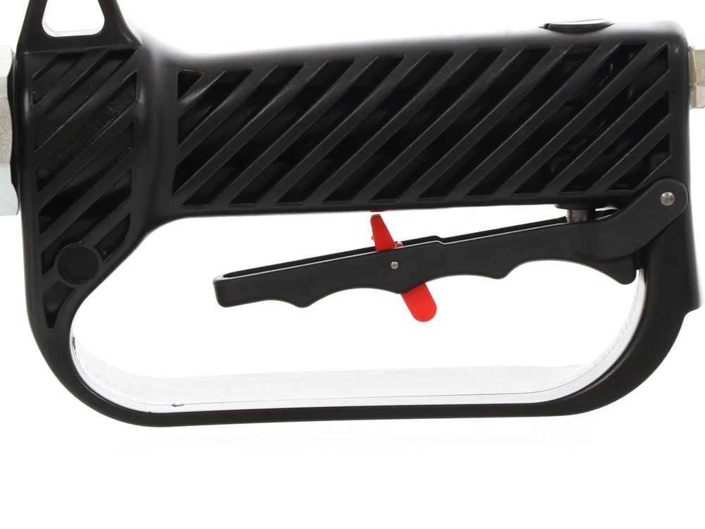 Cette élagueuse dispose d’un frein de chaîne avec blocage qui assure le démarrage de la chaîne uniquement avec l’utilisation des deux mains.