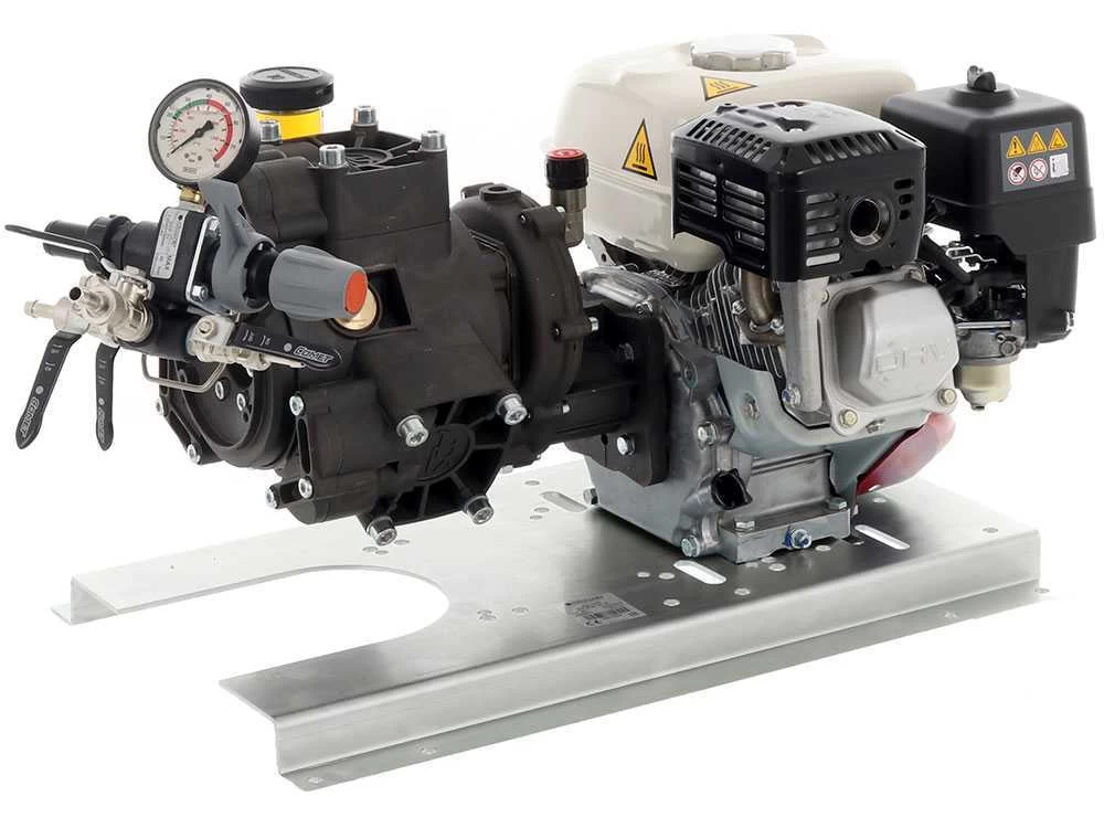 La moto-pompe est directement au moteur thermique, avec un réducteur des tours et du groupe de commande. Elle peut être appliquée à des chariots, pulvérisateurs portatifs ou avec chariots.