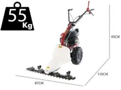 Motofaucheuse autotractée avec moteur essence à 4 temps, poussé par de grandes roues agraires tractées reliées par une transmission à engrenages par bain d’huile. ce modèle est doté du moteur Honda GCVX 170.