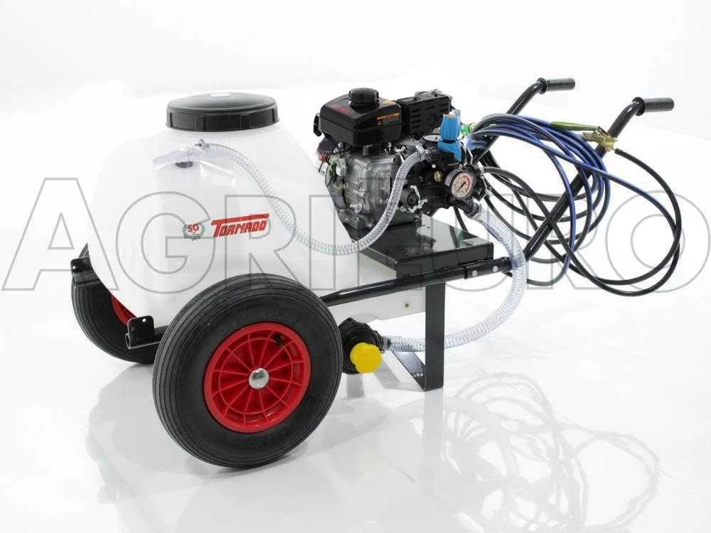 Brouette avec 2 roues pneumatiques de grandes dimensions . Réservoir 80 L en polyéthylène avec filtre d’aspiration externe.
