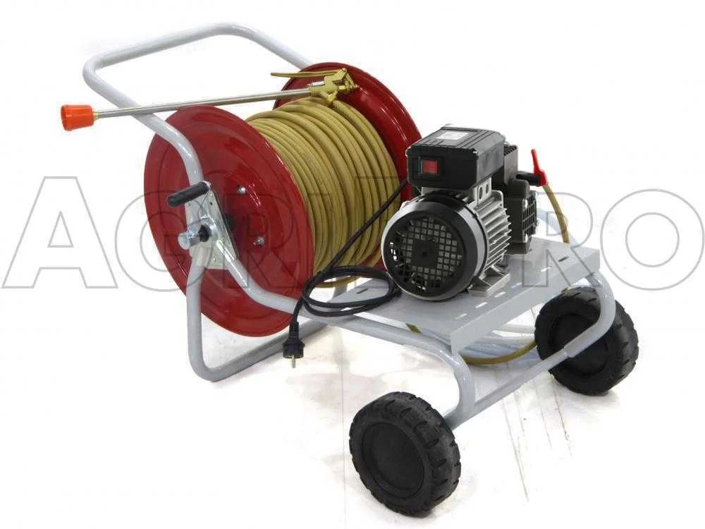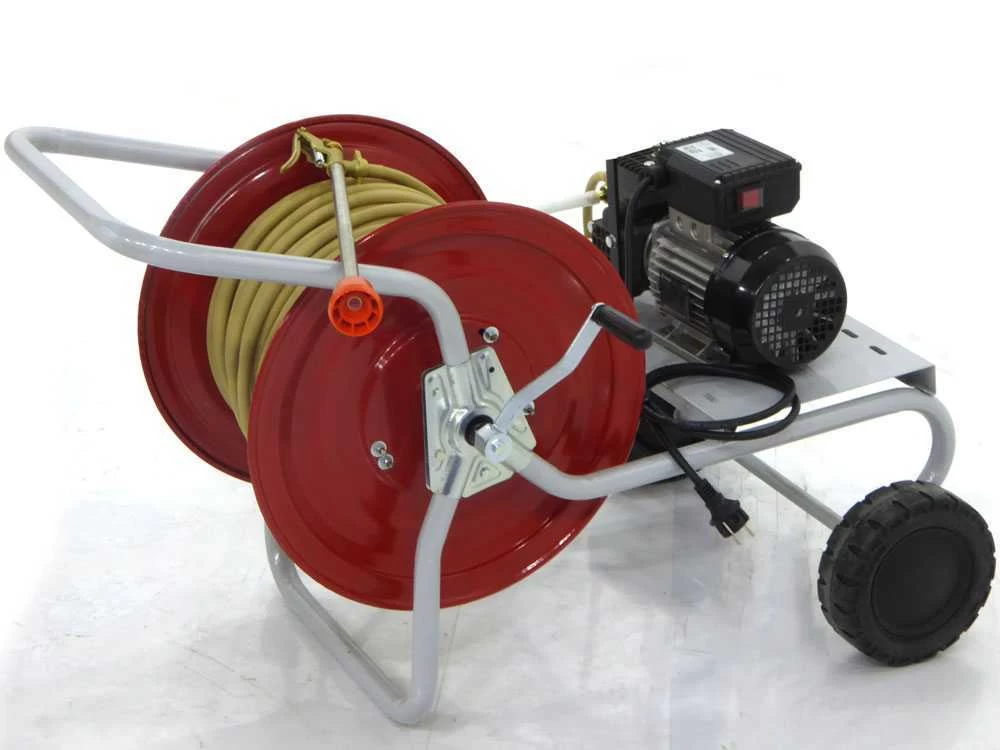 Cette motopompe sur chariot est idéale pour ceux qui ont besoin de laisser le chariot dans sa position initiale en mettant les tuyaux d’aspiration dans une citerne à proximité et en prenant seulement la lance de pulvérisation pour atteindre tous les endroits à traiter sans avoir à traîner avec soi d’autres équipements. L’enrouleur de tuyau peut contenir jusqu’à 200 m de tuyau. Un tuyau supplémentaire est disponible dans les accessoires liés à ce modèle.