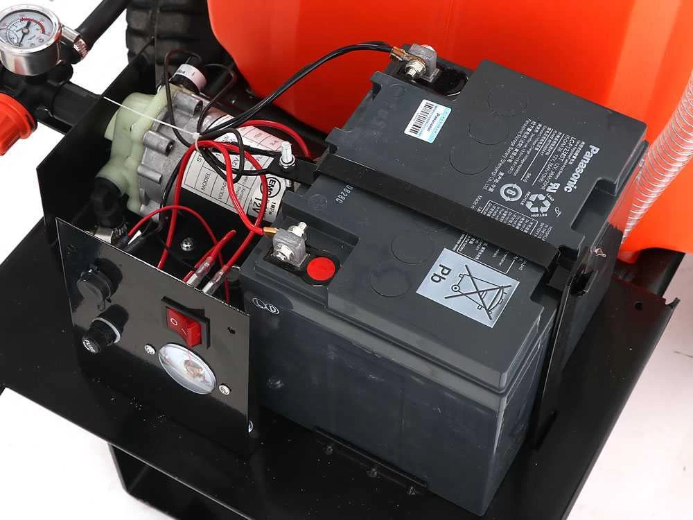 La pompe de pulvérisation est dotée de pressostat, qui assure l’allumage et l’arrêt en automatique de la pompe à l’ouverture et la fermeture de la lance; de cette façon l’effective autonomie correspond au temps réel de pulvérisation.