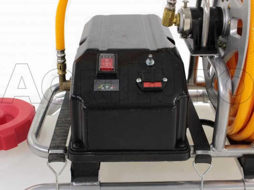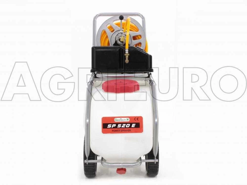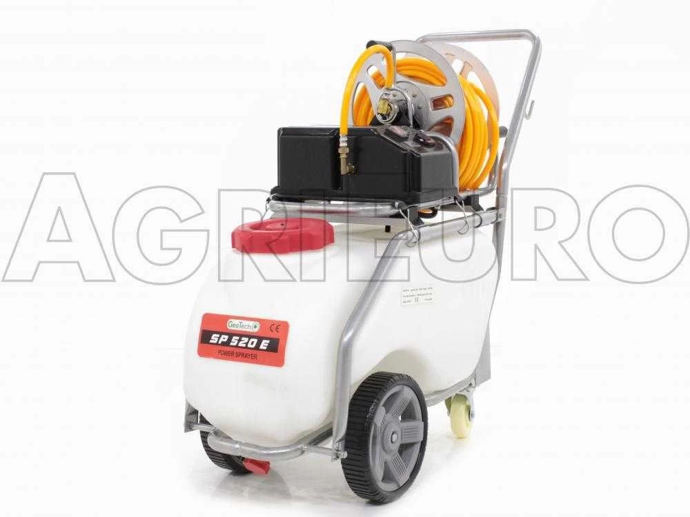 Pulvérisateur électrique GeoTech SP 520 E sur chariot avec moteur électrque à batterie et réservoir de 50 litres.