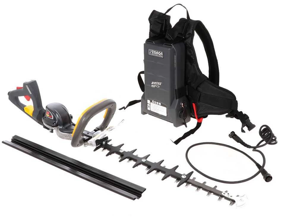 Dans l’emballage vous trouverez aussi une batterie de sac à dos au lithium-ion Zanon de 50,4 volts de 14,5 Ah (Dure trois fois plus longtemps que les batteries normales). Offert : Un adaptateur pratique pour relier les machines compatibles et le transformateur pour recharger la batterie avec le courant de la maison.