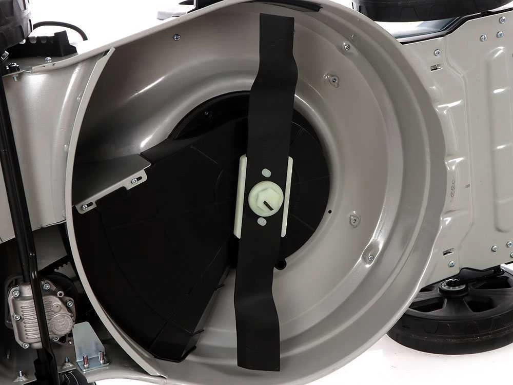 La machine est une traditionnelle 4 en 1, ramassage par bac, obturateur mulching, à éjection arrière et à éjection latérale.