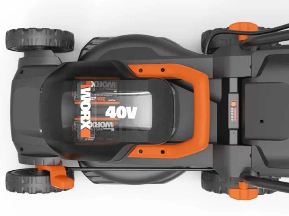 Sur la partie frontale se trouve l’emplacement pour 2 batteries Worx de 4 Ah fournie avec la tondeuse.