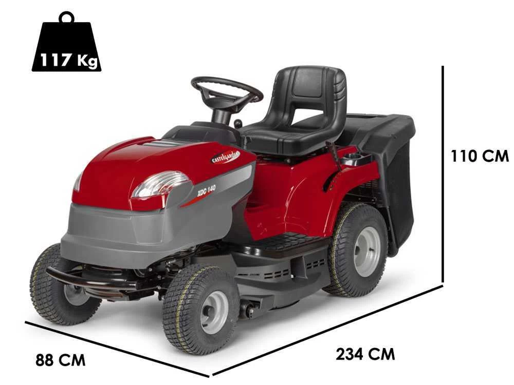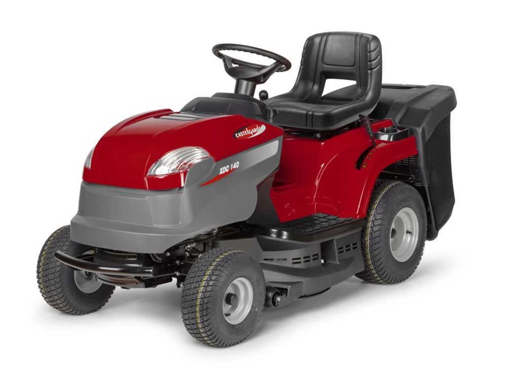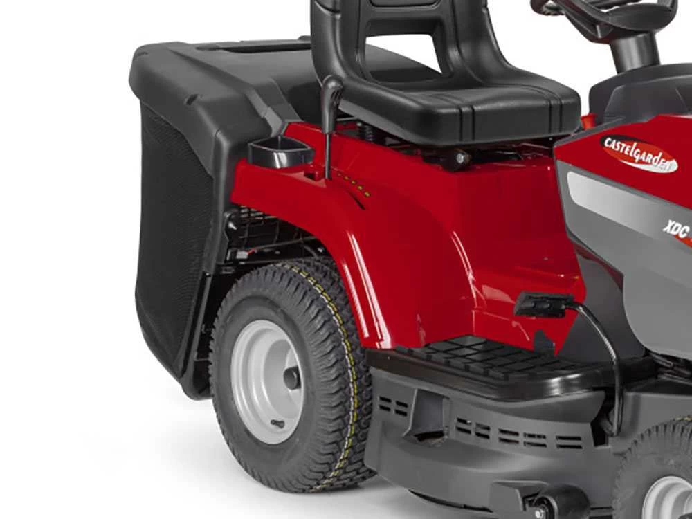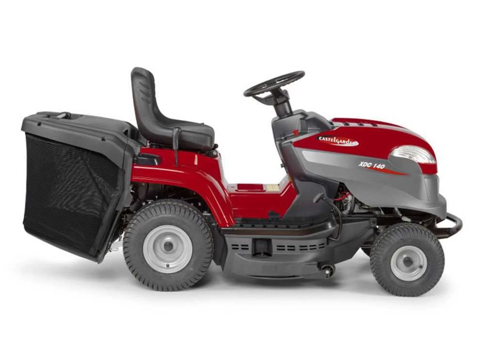 Tracteur tondeuse CastelGarden XDC 140 avec bac de ramassage.